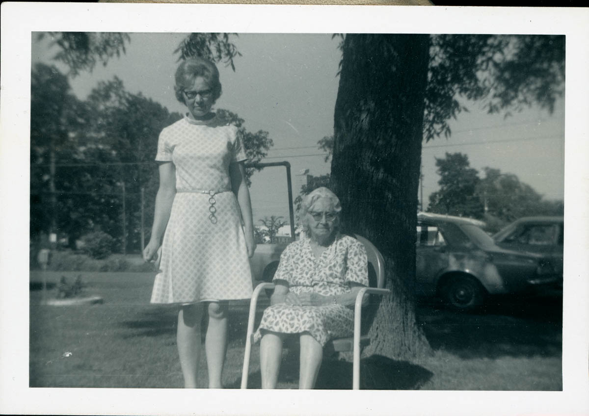 - Snapshot of two women. Handwritten label on back says "Minnie Mae King with mother Ola King"