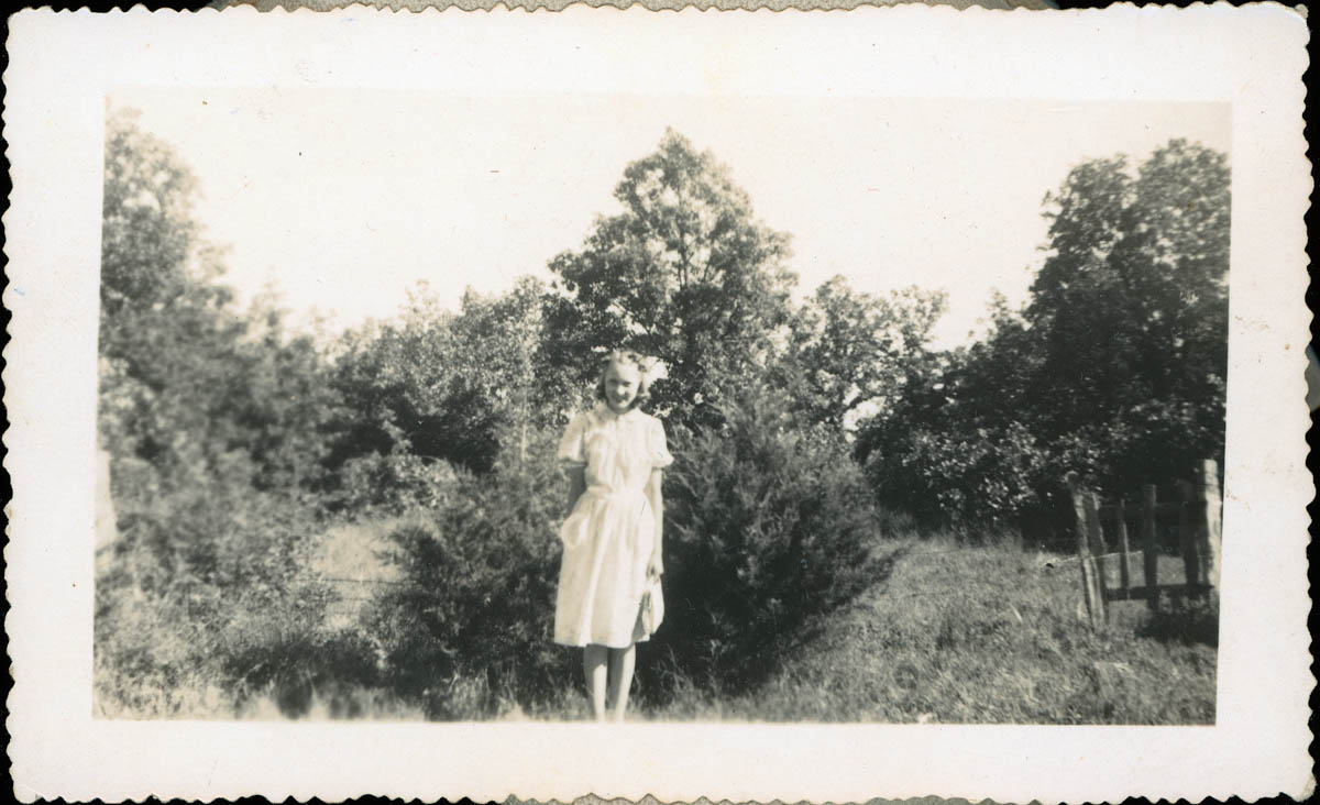 - Snapshot of a young woman standing in front of a tree. Handwritten label on back says "Minnie Mae King 16 years"