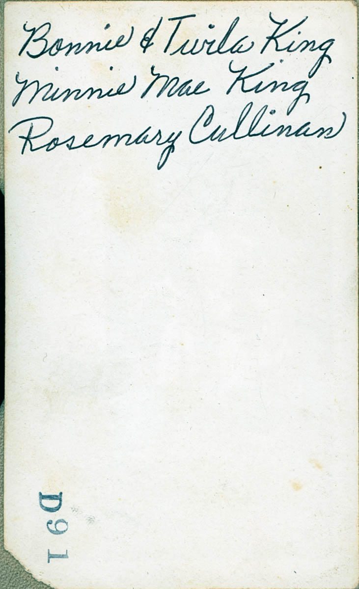 - Snapshot of four girls standing in front of a house. Handwritten label on back says "Bonnie & Twila King, Minnie Mae King, Rosemary Cullinan"