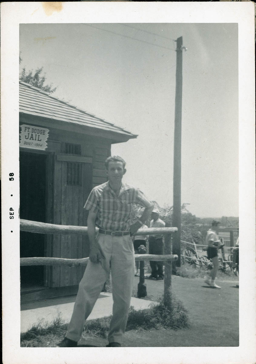 - Snapshot of a man at a tourist attraction. Handwritten label on back says "Sam Lowe"