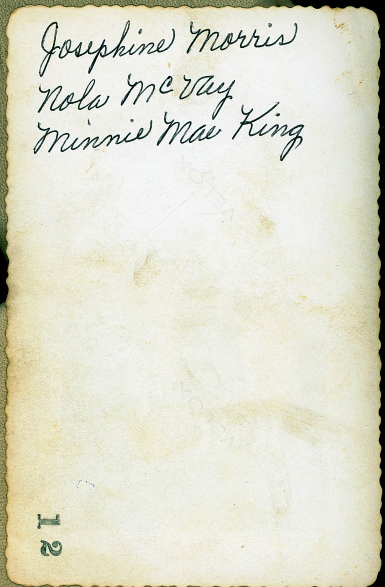 - Snapshot of three young women. Handwritten label on back says "Josephine Morris, Nola McVay, Minnie Mae King"