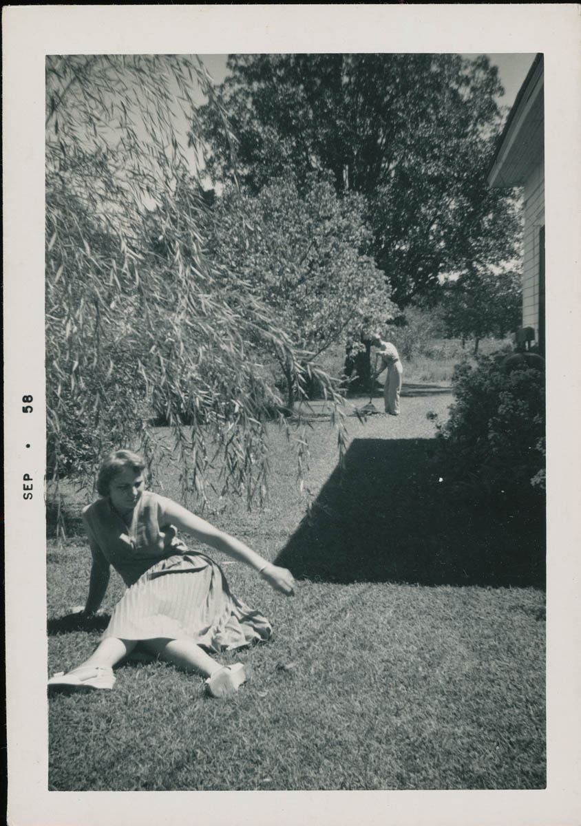 - Snapshot of a woman sitting on a grassy lawn. Handwritten label on back says "Minnie Mae King."