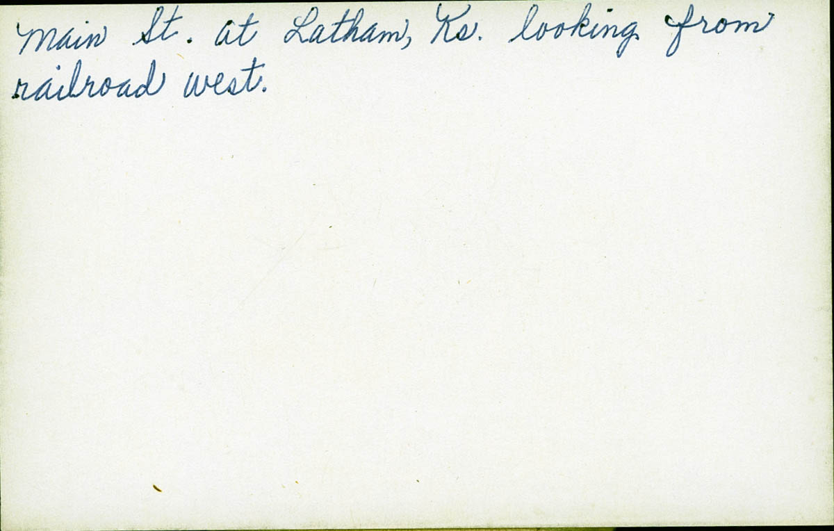 - Snapshot of a town street. Handwritten label on back says "Main St. at Latham, Ks, looking from railroad west."