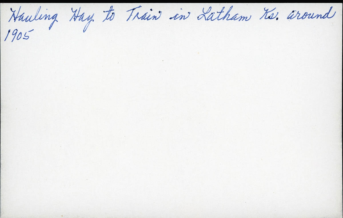- Snapshot of men driving horse wagons loaded with hay near a railway train. Handwritten label on back says "Hauling hay to train in Latham Ks. Around 1905"