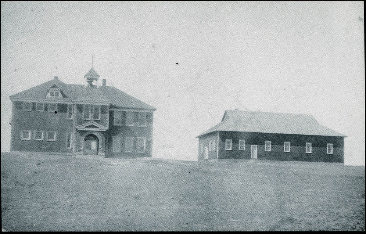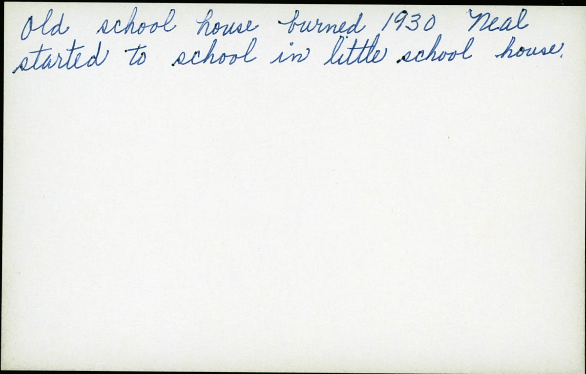 - Snapshot of two school buildings. Handwritten label on back says "Old school house burned 1930 Neal started to school in little school house"