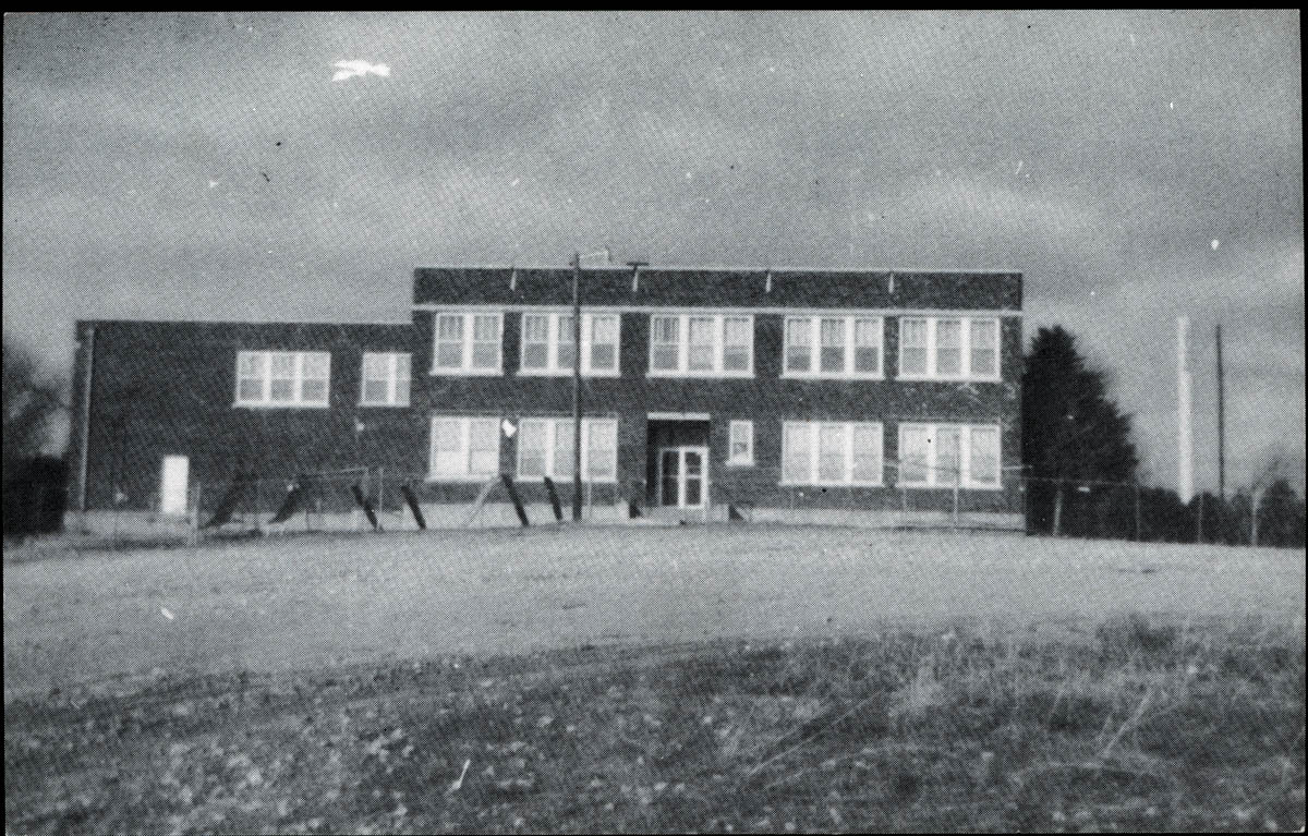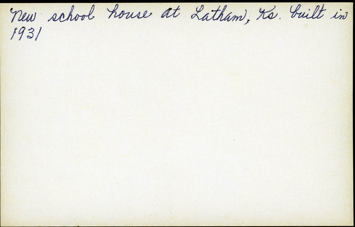 - Snapshot of a school building. Handwritten label on back says "New school house at Latham, Ks. Built in 1931"