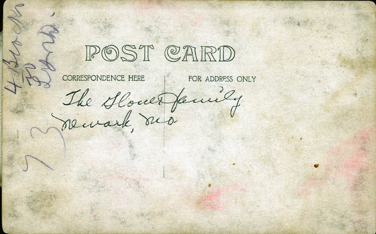 - Real photo postcard of six people sitting on a house porch. Handwritten label on back says "The Glower Family, Newark, Mo."