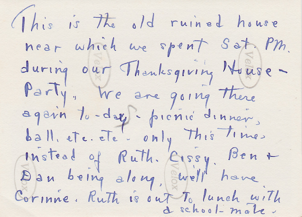 Handwritten label on back says "This is the old ruined house near which we spent Sat. PM during our Thanksgiving House-Party. We are going there again today - picnic dinner, ball, etc. etc. -- only this time, instead of Ruth, Cissy, Ben & Dan being along, we'll have Corinne. Ruth is out to lunch with a school-mate" - Creator