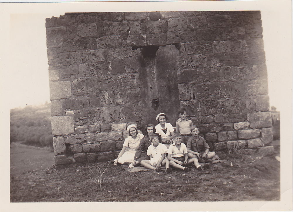 - Snapshot of several people in front of a ruined house