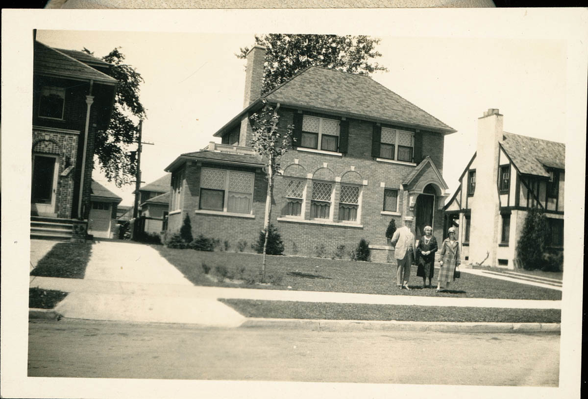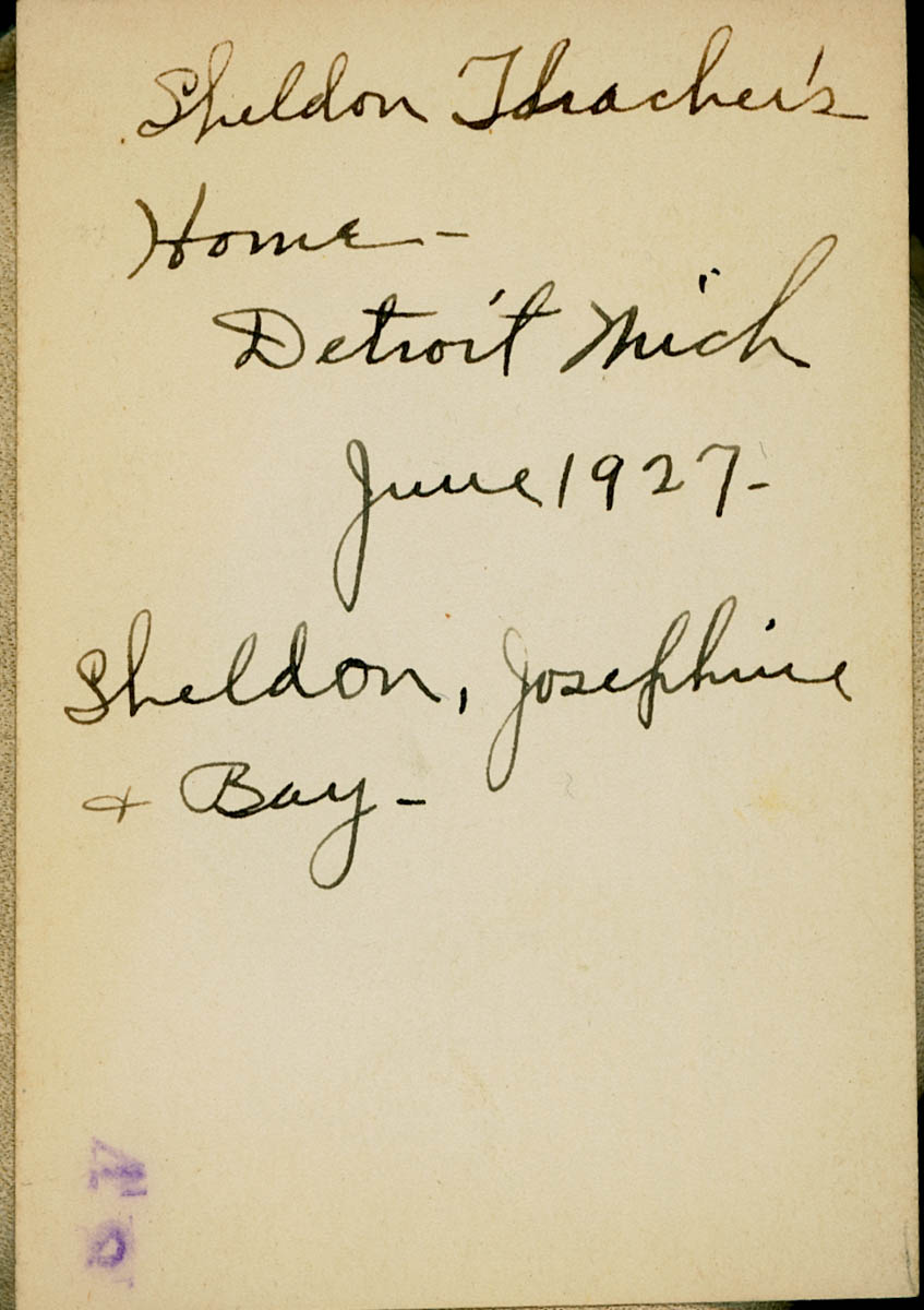 - Snapshot of three people standing in front of a house. Handwritten label on back says "Sheldon Thacher's Home -- Detroit Mich Jun 1927 -- Sheldon, Josephine & Bay." This is an item in a scrapbook.