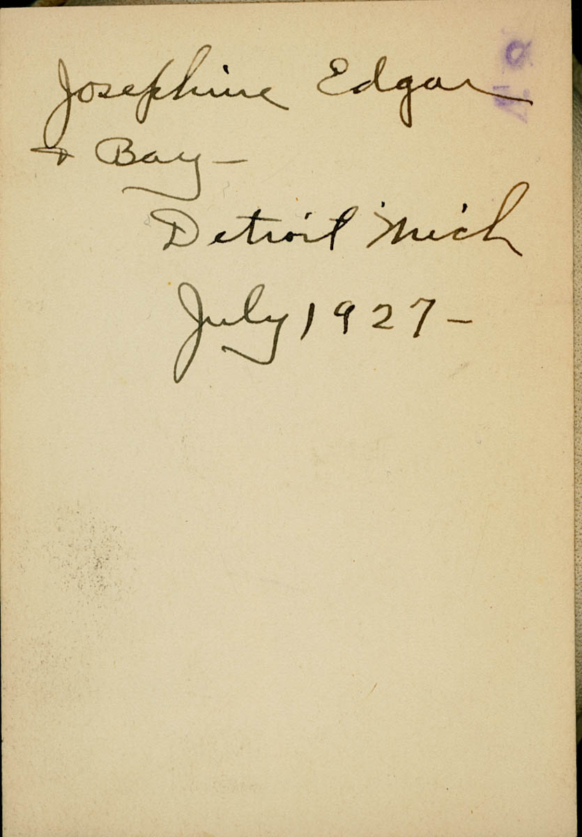 - Snapshot of three people standing in front of a house. Handwritten label on back says "Josephine Edgar & Bay -- Detroit Mich July 1927." This is an item in a scrapbook.