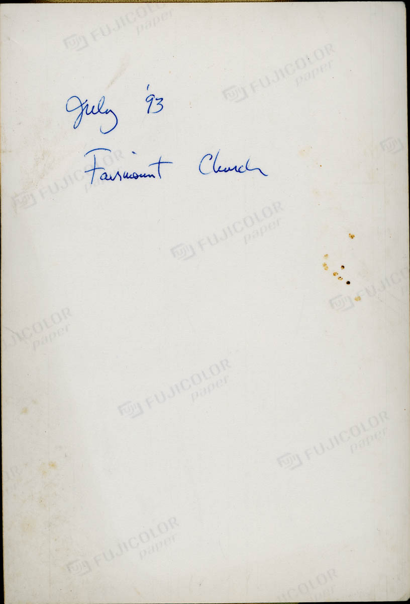 - Snapshot of the interior of a church. Handwritten label on back says "July '93 Fairmount Church"