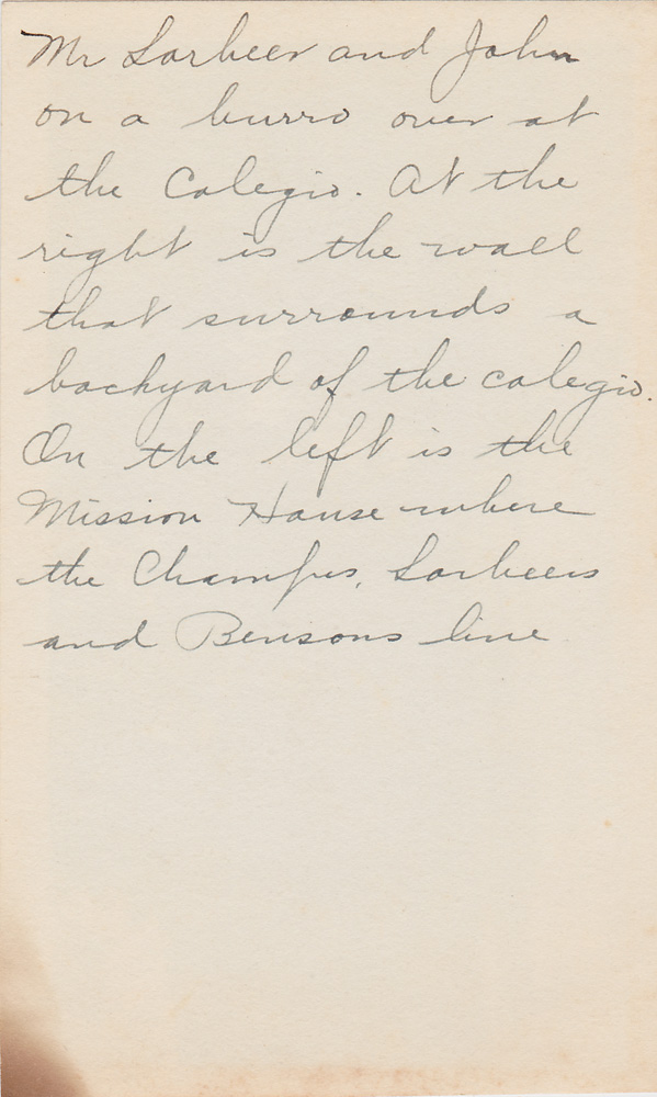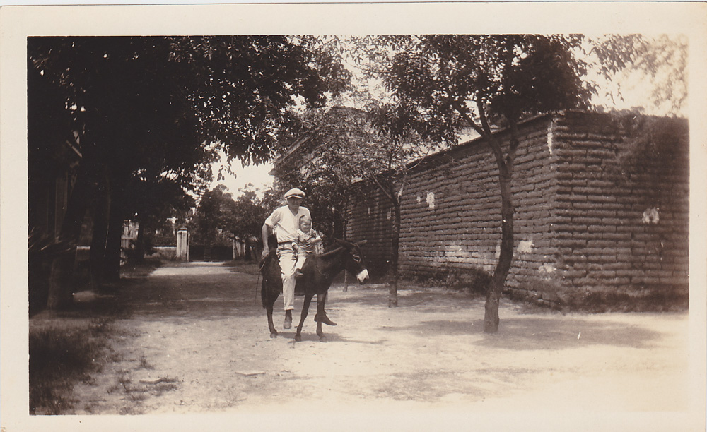 Handwritten label on back says "Mr. Sarheer and John on a burro over at the Calegio. At the right is the wall that surrounds a backyard of the calegio. On the left is the Mission House where the Champs, Sarheers and Bensons live" - Creator