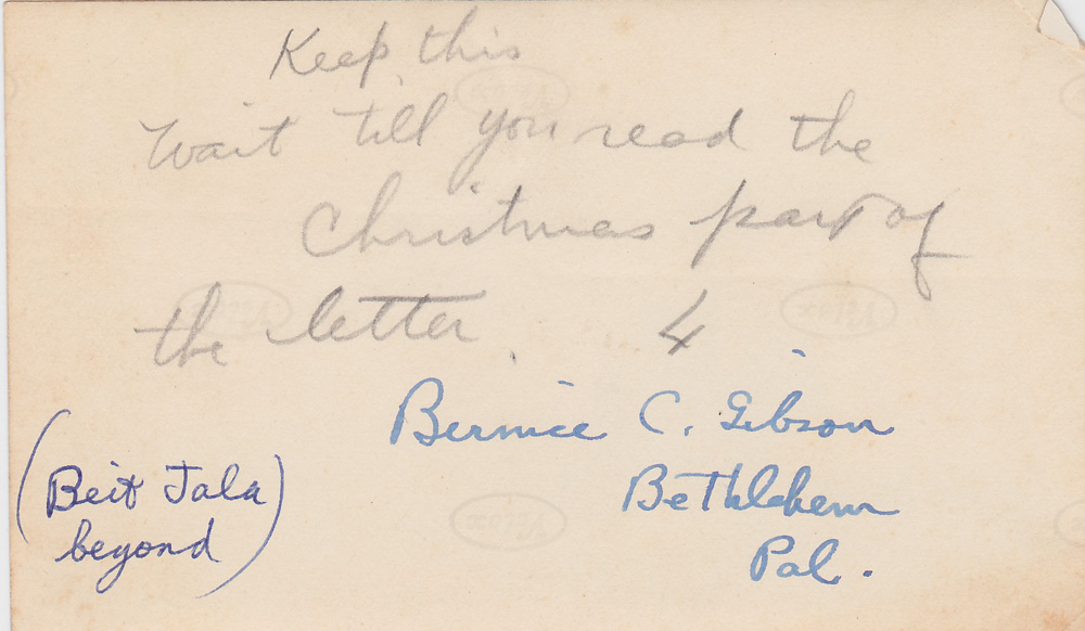 Handwritten label on back says "Keep this. Wait until you read the Christmas part of the letter. 4 Bernice C. Gibson, Bethlehem, Pal. (Beit Jala beyond)" - Creator