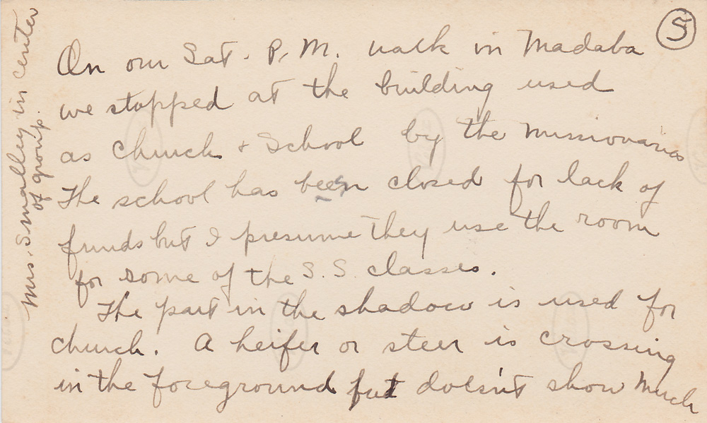 Handwritten label on back says "On our Sat. P.M. walk in Madaba we stopped at the building used as church & school by the missionaries. The school has been closed for lack of funds but I presume they use the room for some of the S.S. classes. The part in the shadow is used for church. A heifer or steer is crossing in the foreground but doesn't show much. Mrs. Smalley in center of group" - Creator