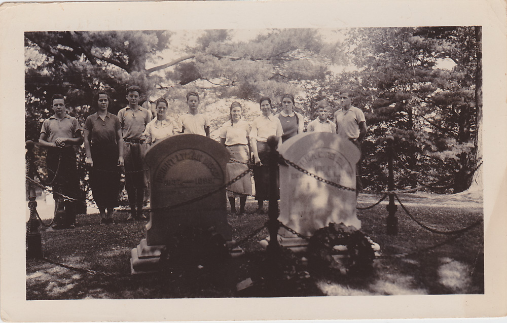 Handwritten label on back says "July 8, 1936 Picture No. 5 Northfield, Mass. Mr. & Mrs. Moody's graves at 'Round Top.' Left to right: Bob, Almeta, John, Grace, Howard, Alice, Martha, Lorna, Arnold, and Curtis. To chain, then return please." - Date