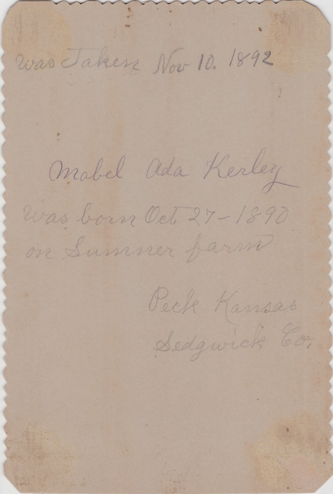 Handwritten note on back says "was taken Nov. 10 1892. Mabel Ada Kerley was born Oct 27 1890 on Sumner farm. Peck Kansas, Sedgwick Co." - Date