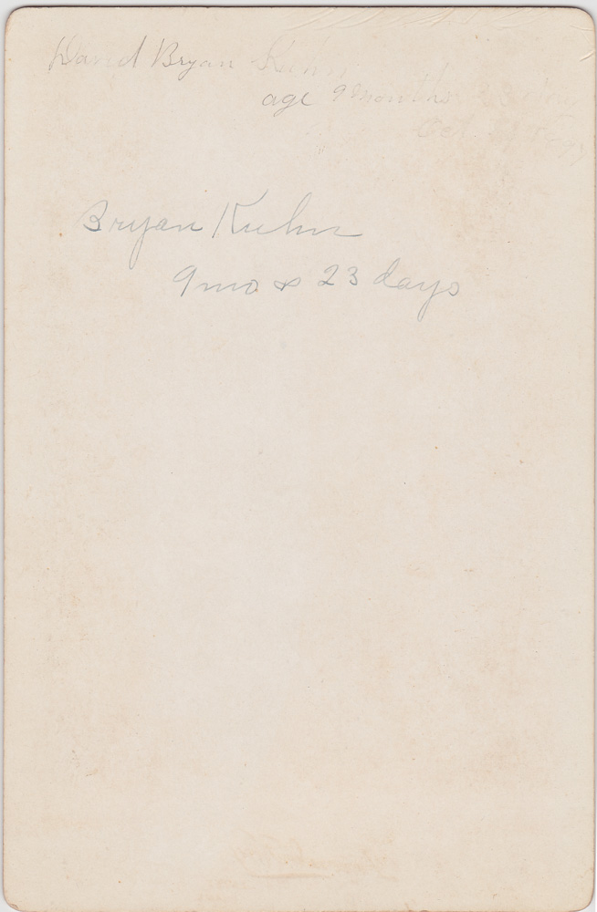 Handwritten note on back says "David Bryan Kuhn age 9 months 23 days, Oct [illegible] 1897. Bryan Kuhn 9 mo & 23 days" - Date