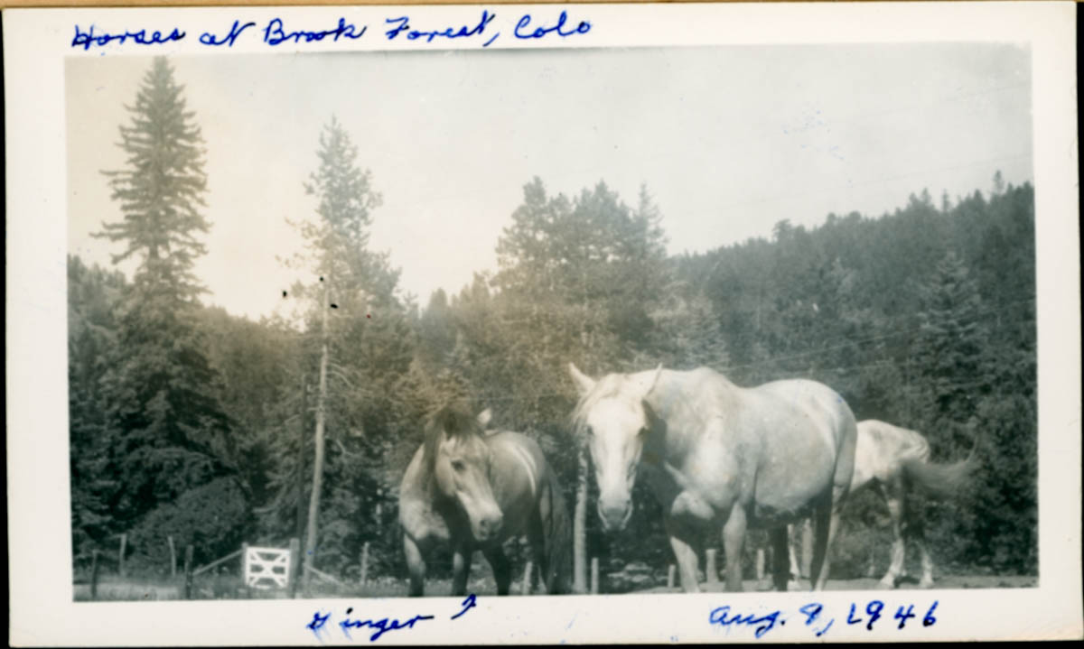 Handwritten label on front says "Horses at Brook Forest Colo. Ginger Aug. 9, 1946" - Date