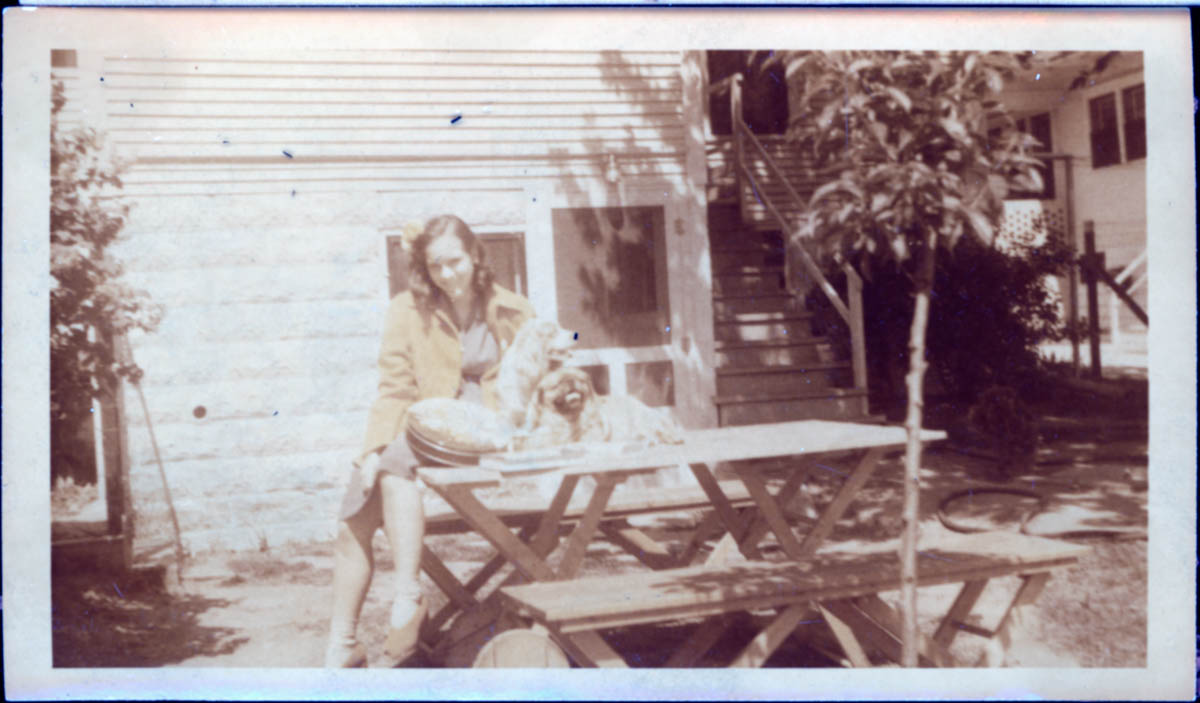 - A snapshot of a young woman and two dogs sitting on a picnic table