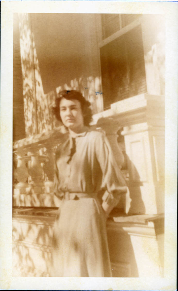 - Snapshot of a young woman standing in front of a house