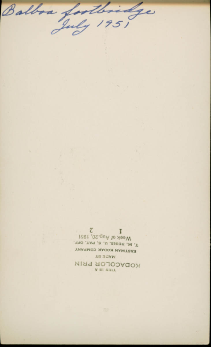 Handwritten label on back says "Balboa footbridge - July 1951" - Date