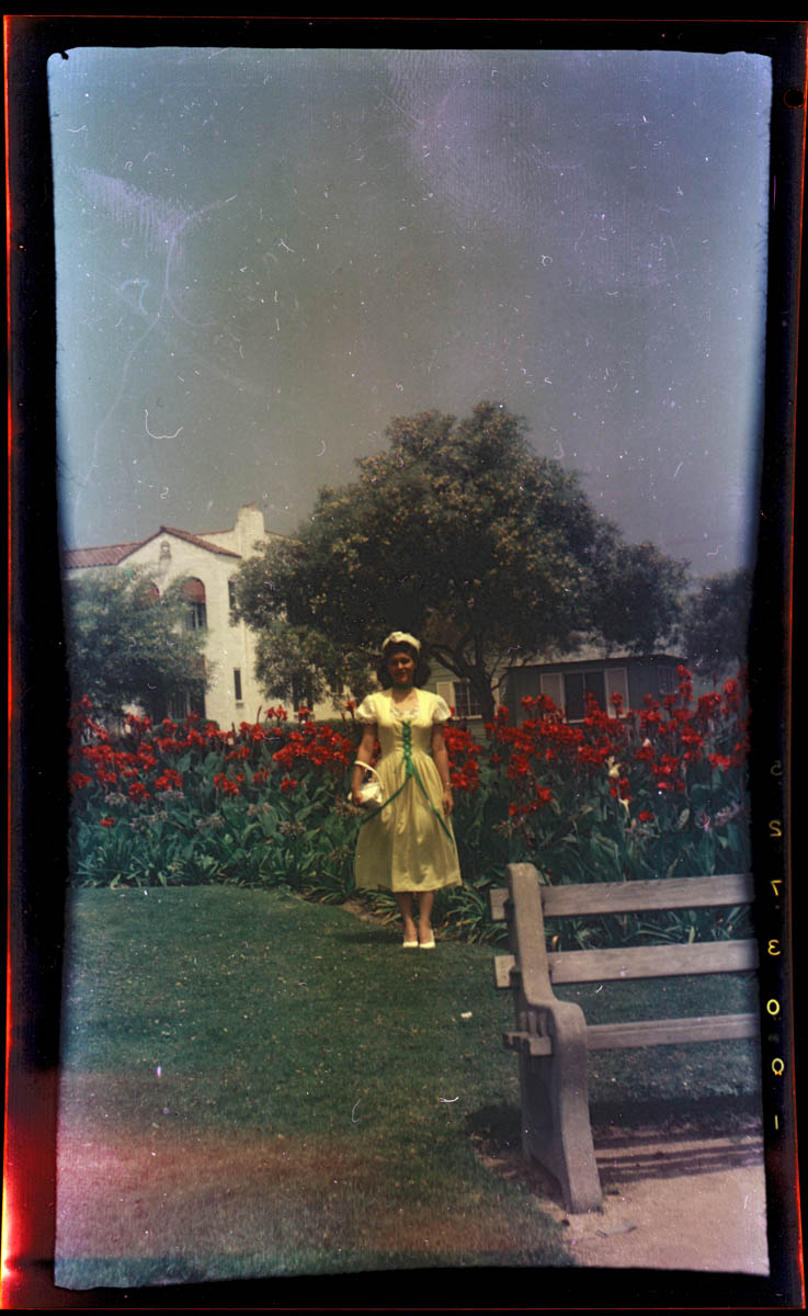 - Snapshot of a young woman in yellow dress in front of a bed of red flowers