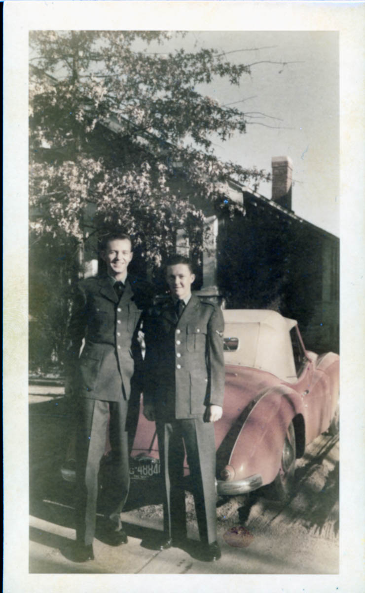 - Snapshot of two men in uniform standing in front of a car