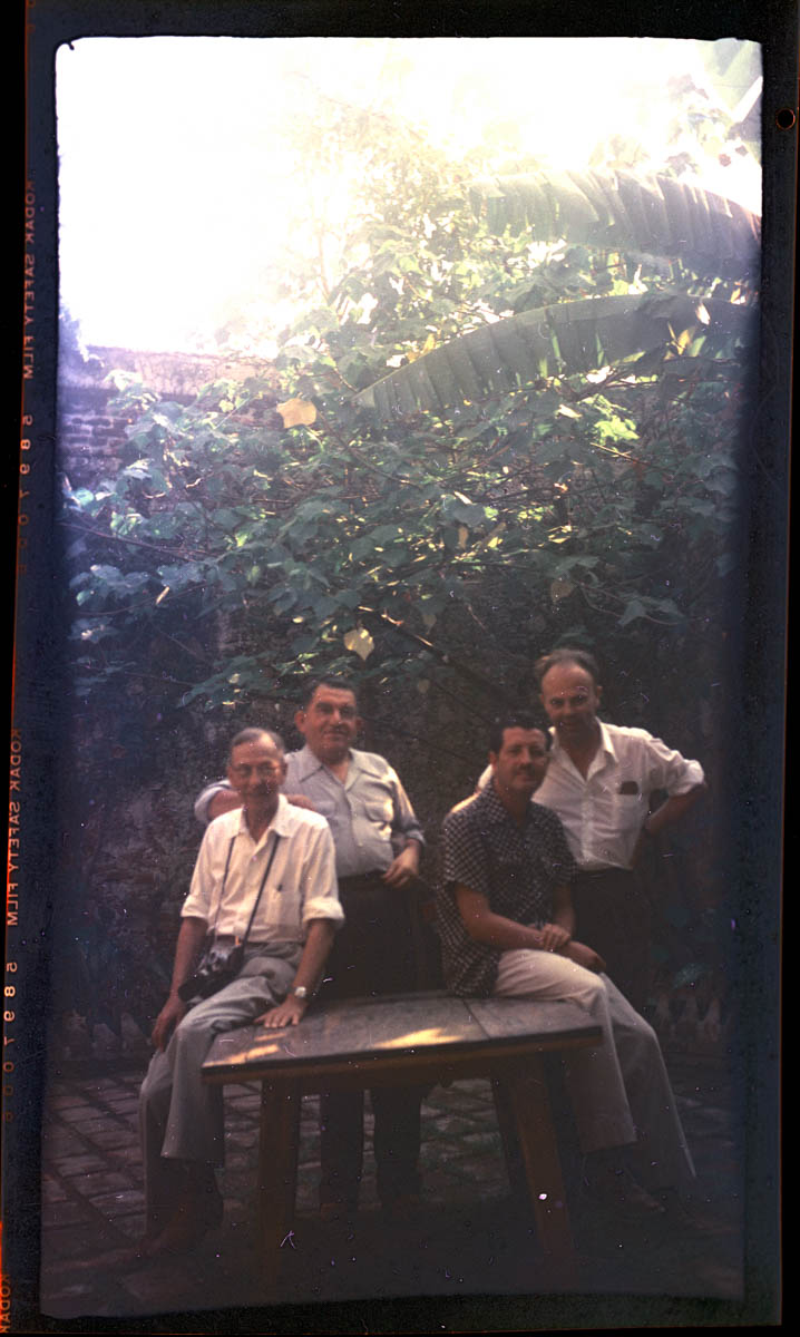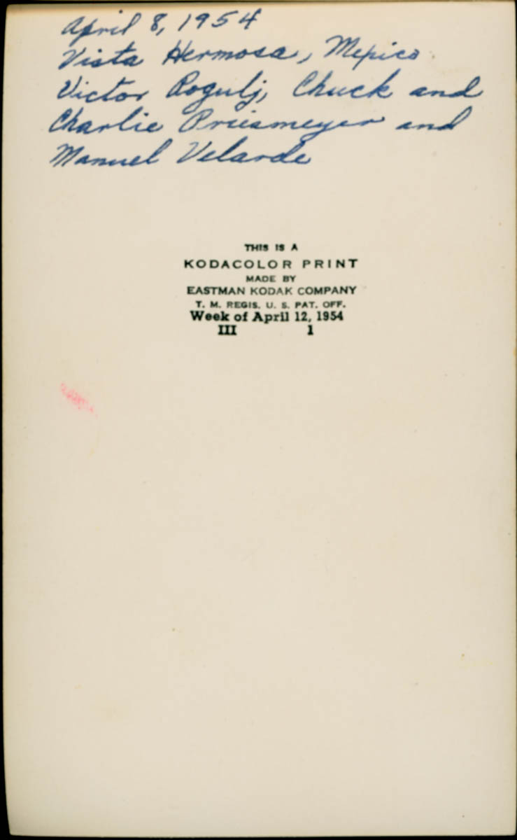Handwritten label on back says "April 8, 1954 Vista Hermosa, Mexico Victor Rogulj, Chuck and Charlie Priesmeyer and Manuel Velarde" - Date