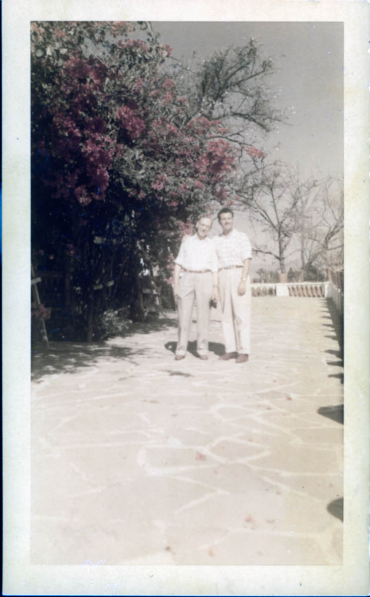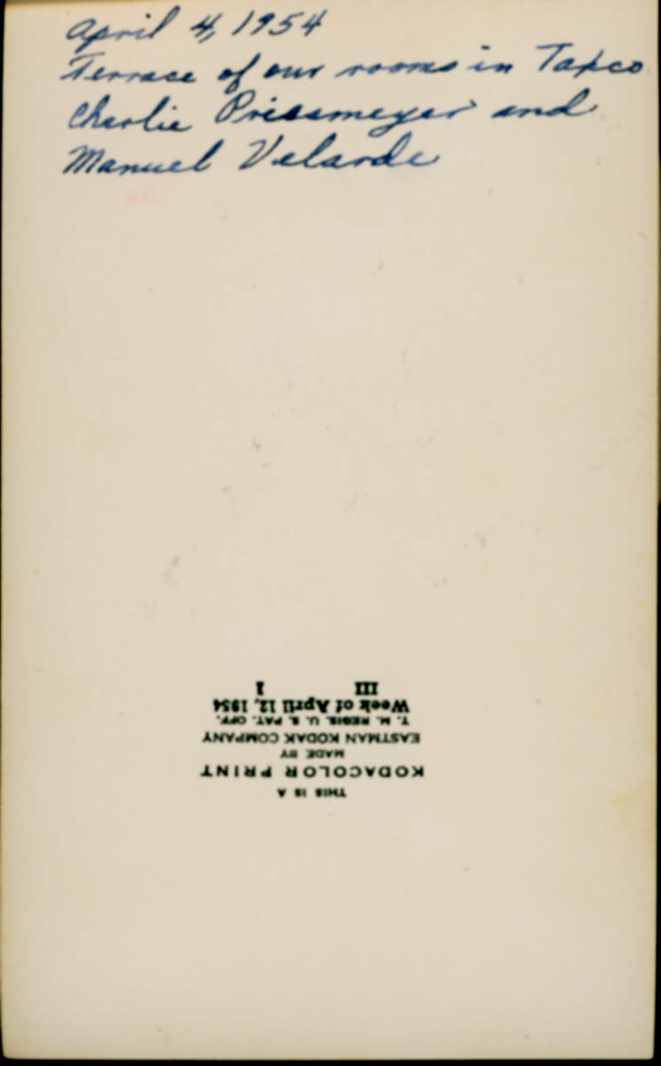 Handwritten label on back says "April 4, 1954 Terrace of our rooms in Taxco. Charlie Priesmeyer and Manuel Velarde" - Date