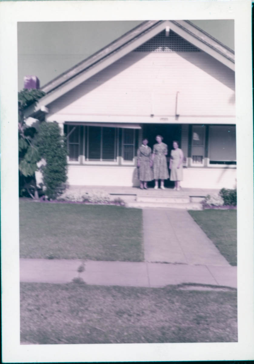 - Snapshot of three women standing on a porch