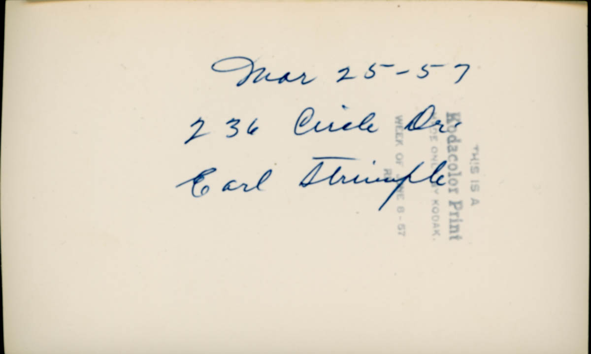 Handwritten label on back says "Mar 25 - 57 236 Circle Dr - Earl Strimple" - Date
