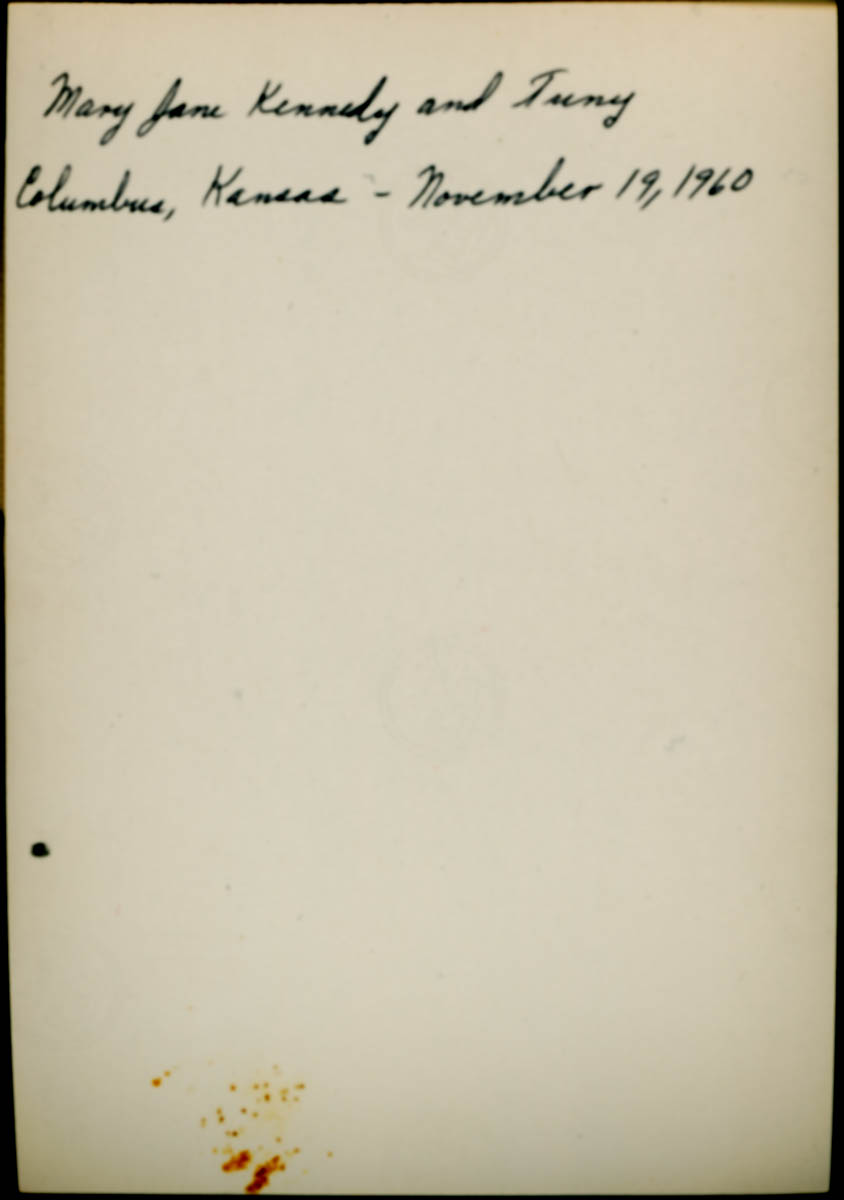 Handwritten label on back says "Mary Jane Kennedy and Tuny Columbus, Kansas - November 19, 1960" - Date