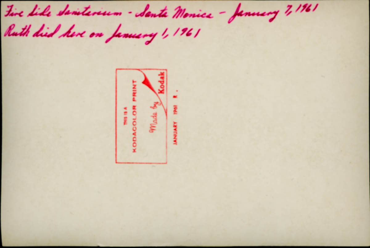 Handwritten label on back says "Fire Side Sanitarium - Santa Monica - January 7, 1961 Ruth died here on January 1, 1961" - Date