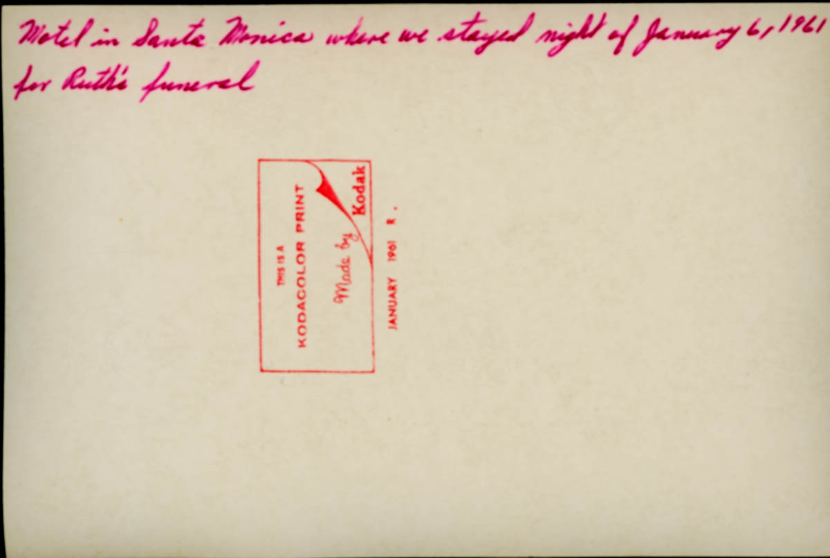 Handwritten label on back says "Motel in Santa Monica where we stayed night of January 6, 1961 for Ruth's funeral" - Date