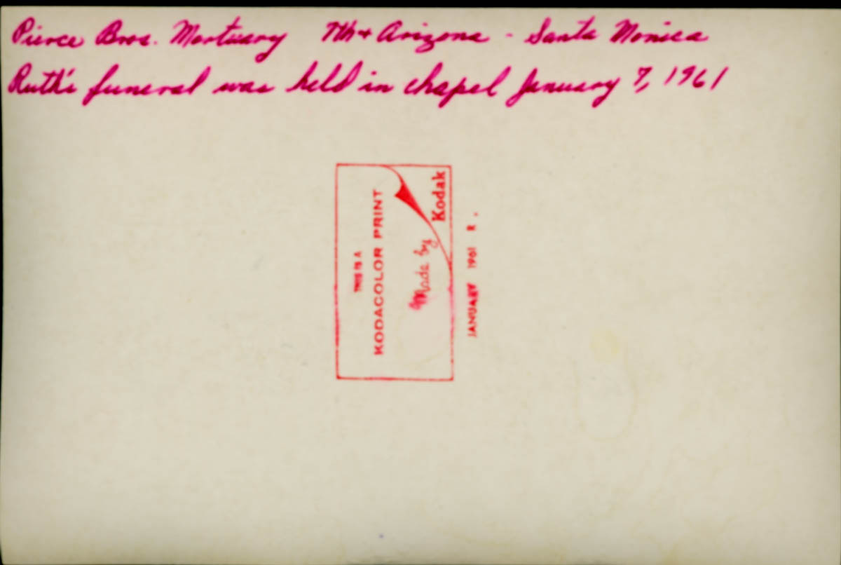 Handwritten label on back says "Pierce Bros. Mortuary 7th Arizona - Santa Monica Ruth's funeral was held in chapel January 7, 1961" - Date