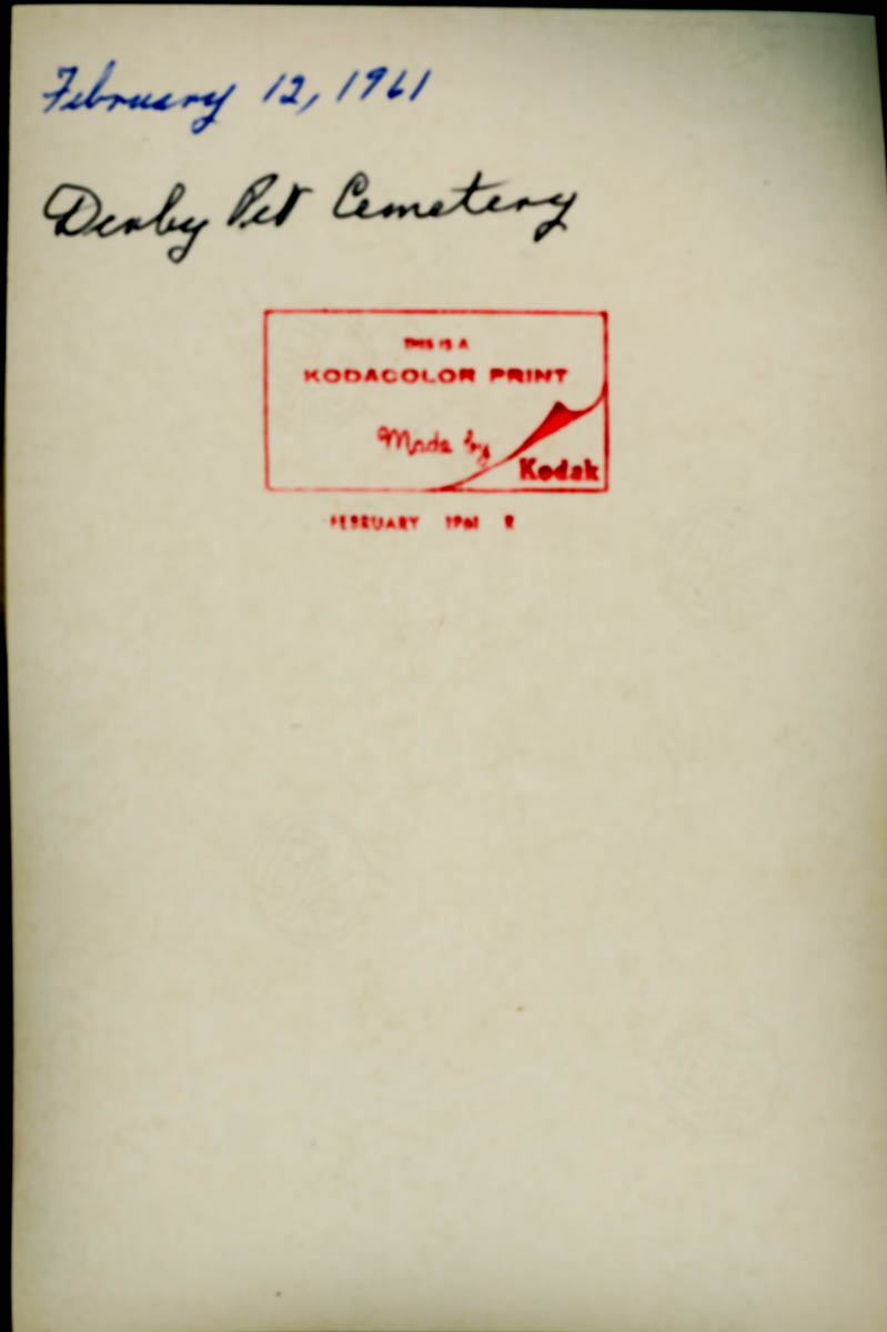 Handwritten label on back says "February 12, 1961 Derby Pet Cemetery" - Date