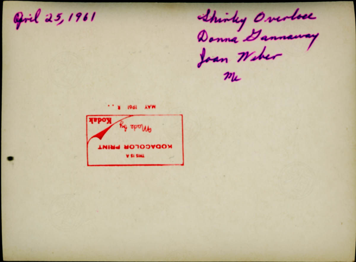 Handwritten label on back says "April 25, 1961 Shirley Overbee, Donna Gannaway, Joan Weber, Me" - Date