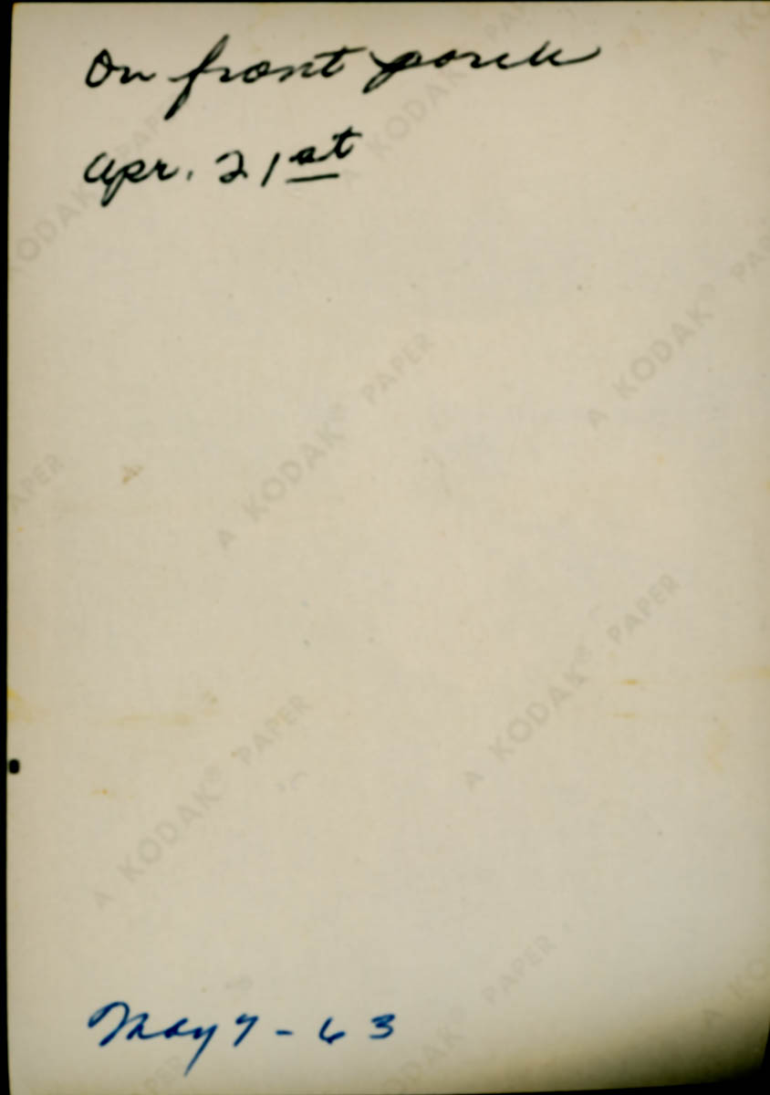 Handwritten label on back says "On front porch Apr. 21st May 7 - 63" - Date