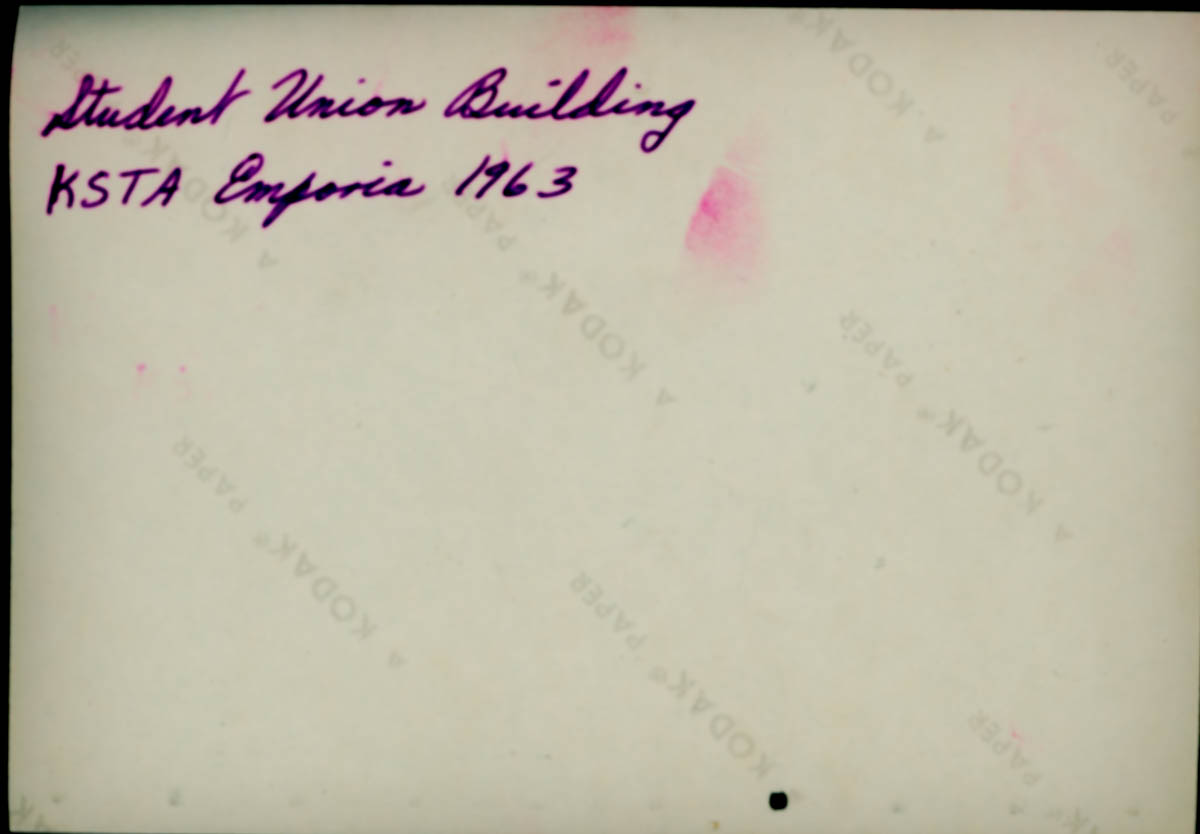 Handwritten label on back says "Student Union Building KSTA Emporia 1963" - Date