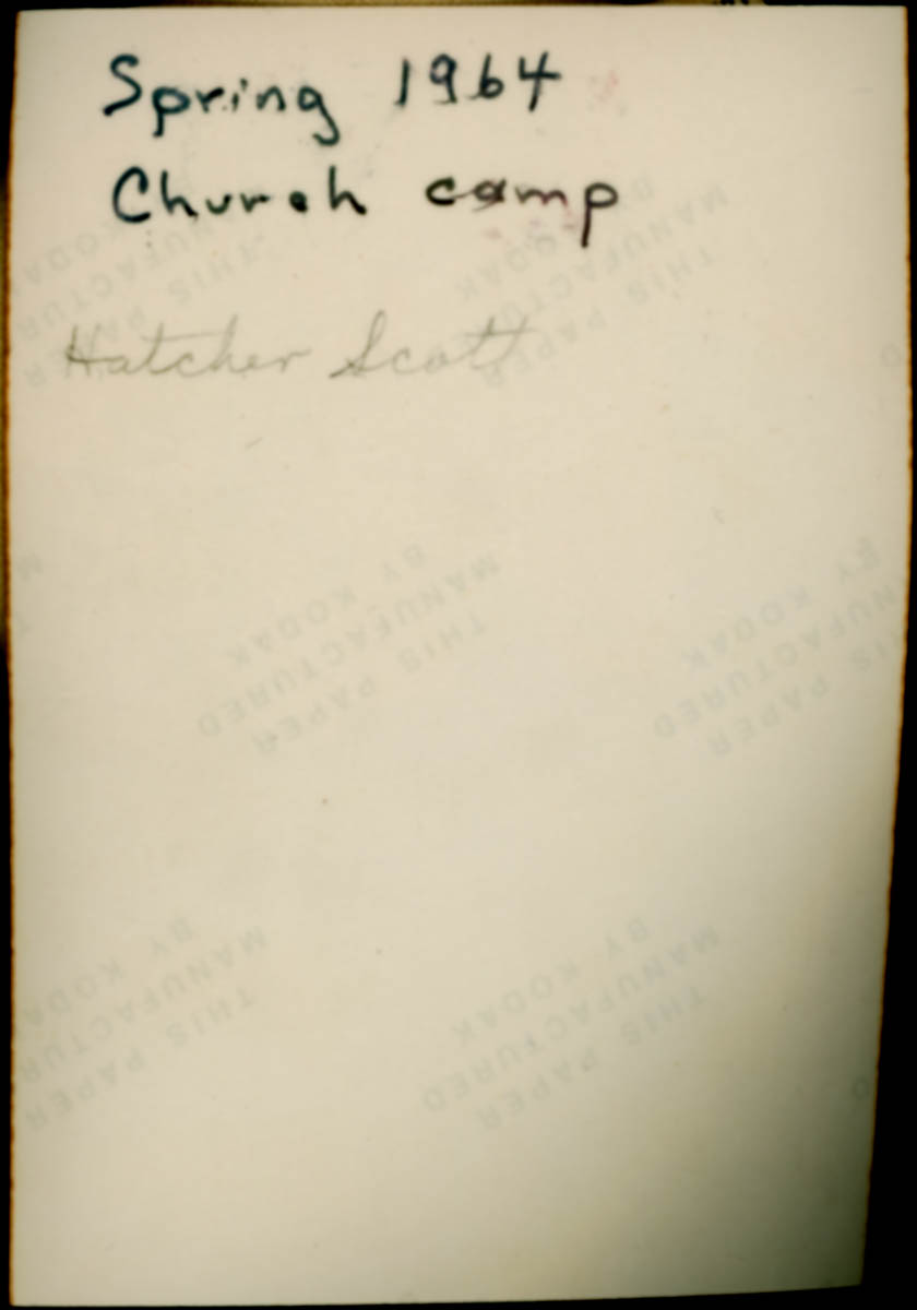 Handwritten label on back says "Sprint 1964 Church camp Hatcher Scott" - Date