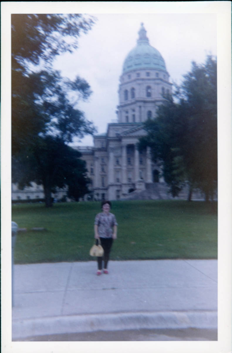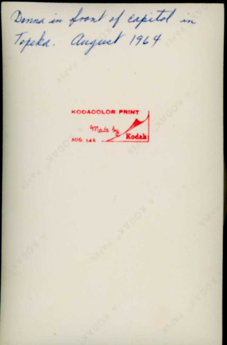Handwritten label on back says "Donna in front of capitol in Topeka. August 1964" - Date