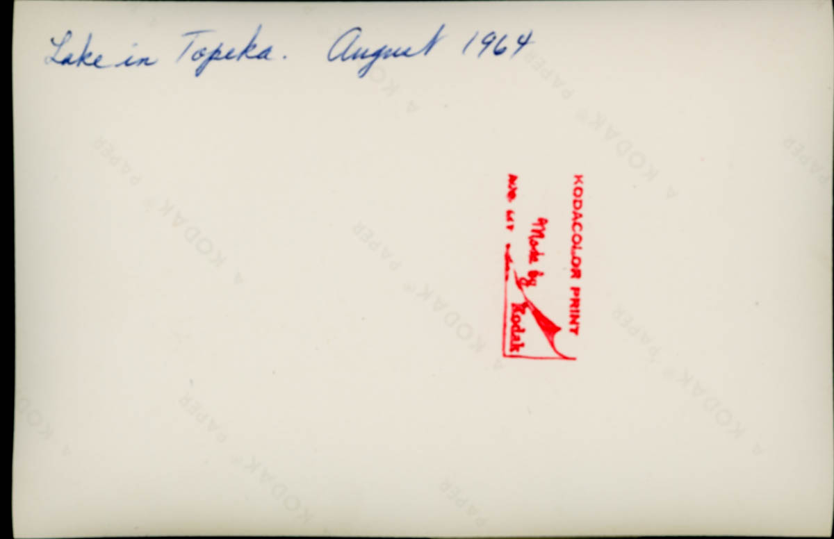 Handwritten label on back says "Lake in Topeka. August 1964" - Date