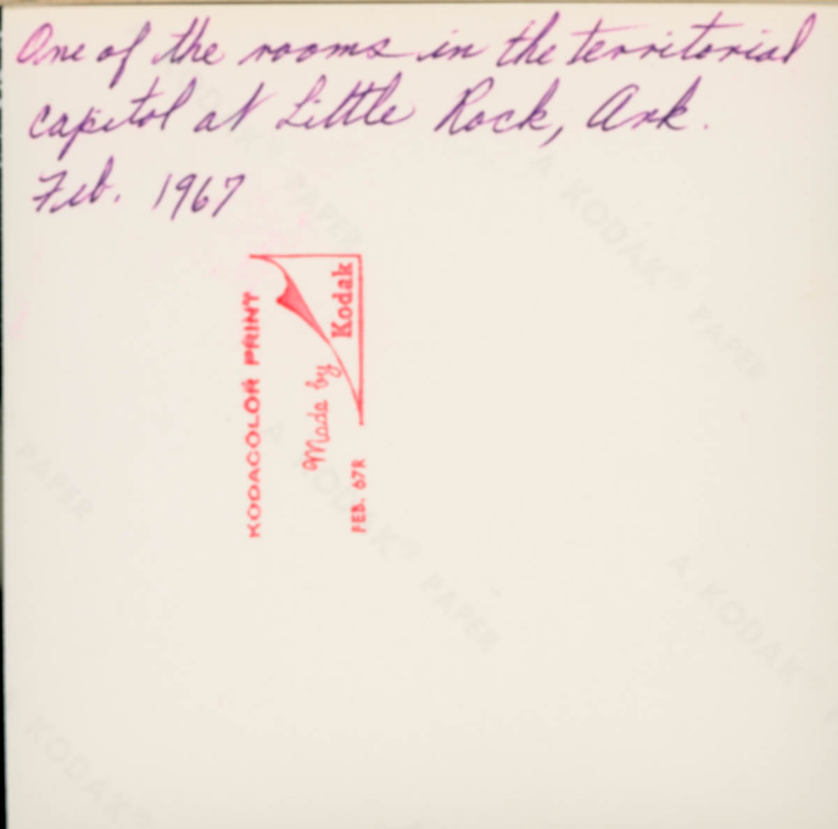 Handwritten label on back says "One of the rooms in the territorial capital at Little Rock, Ark. Feb. 1967" - Date