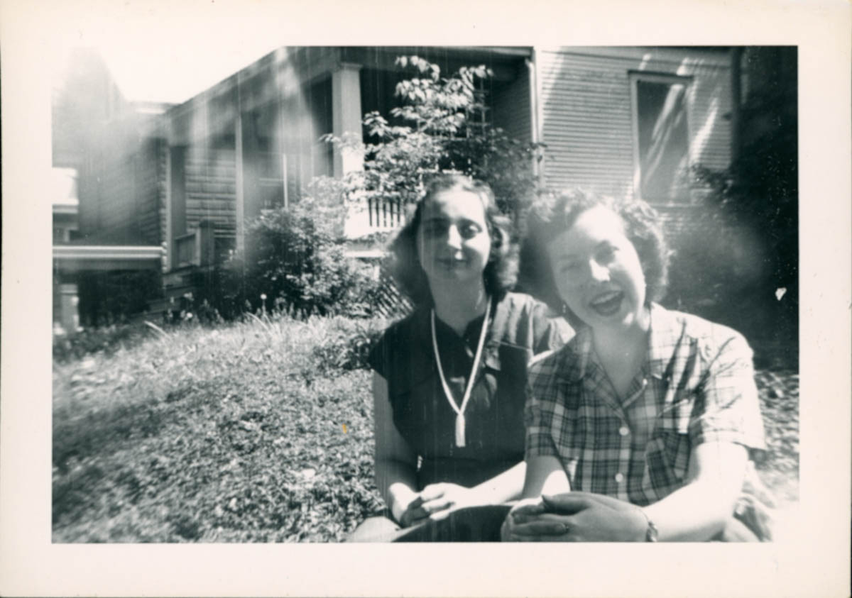 - Snapshot of two young women sitting on the grass in front of a house