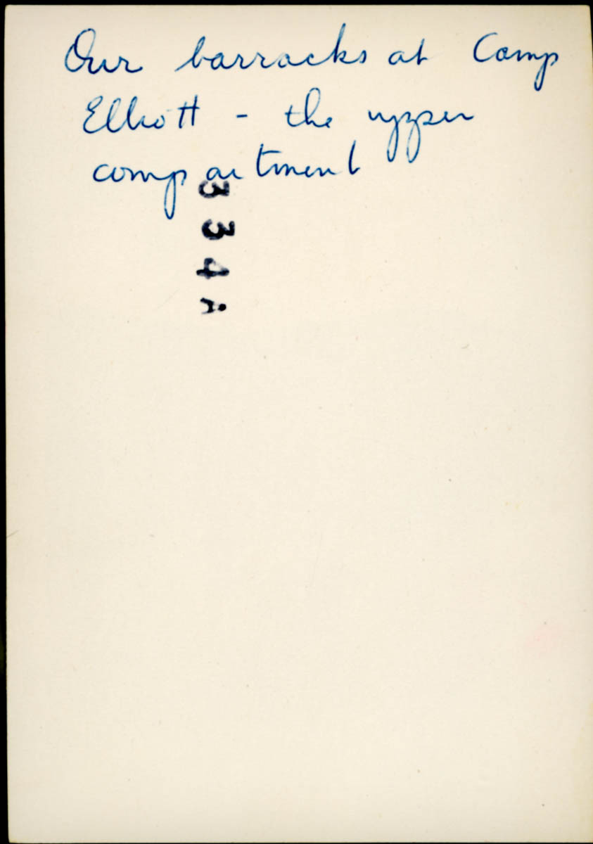Handwritten label on back says "Our barracks at Camp Elliott - the upper compartment" - Creator