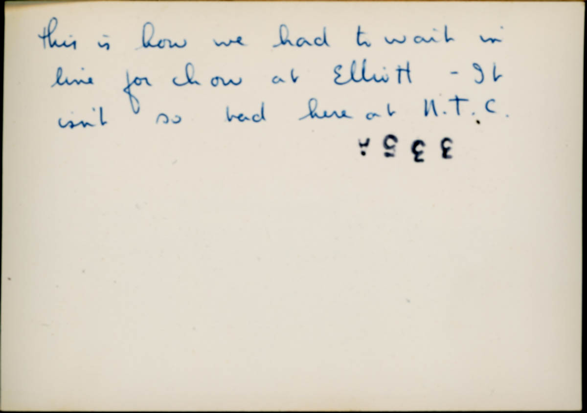 Handwritten label on back says "This is how we had to wait in line for chow at Elliott - It isn't so bad here at N.T.C. - Creator