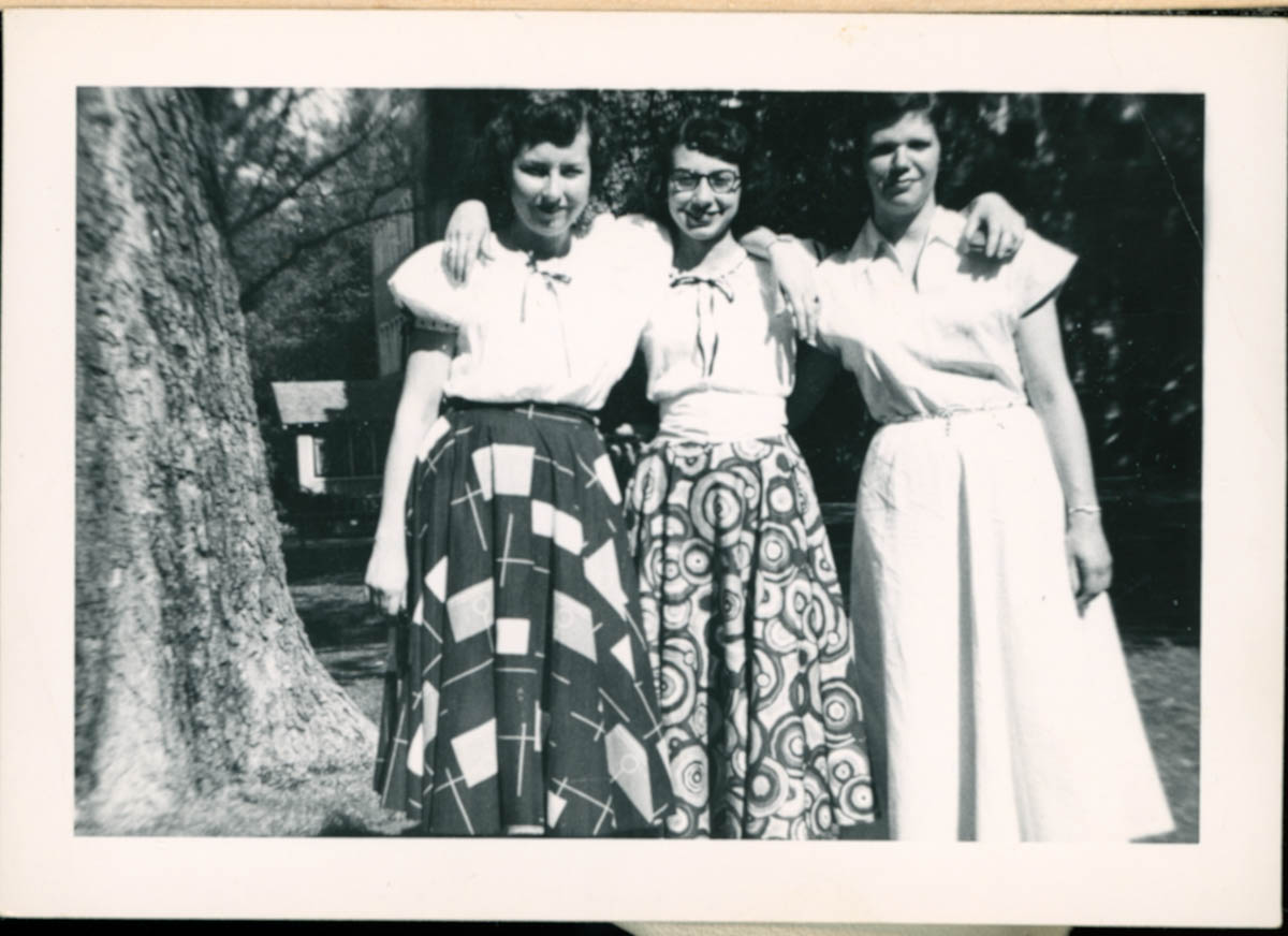 - Snapshot of three young women standing by a tree