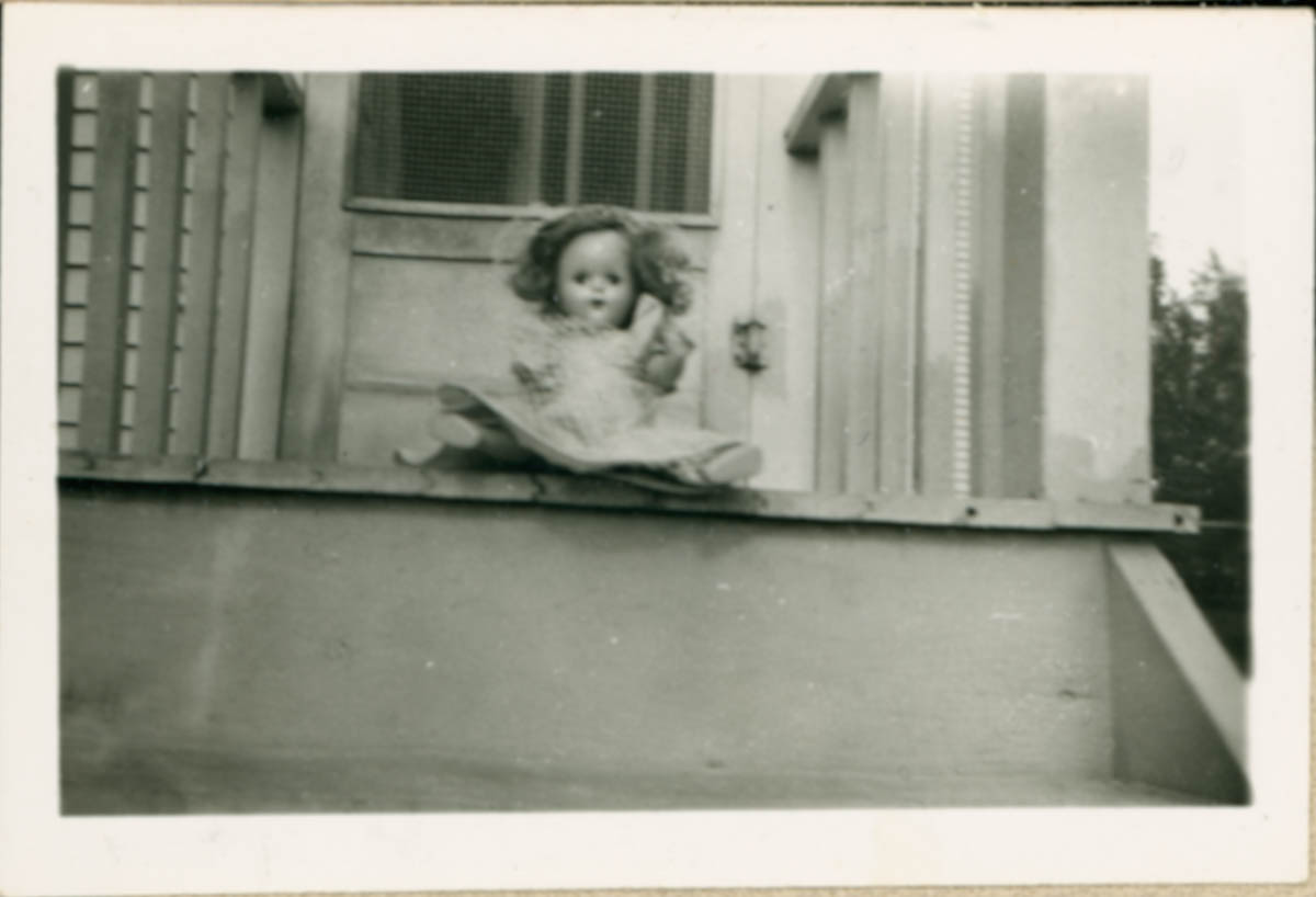 - Snapshot of a doll on the steps of a house