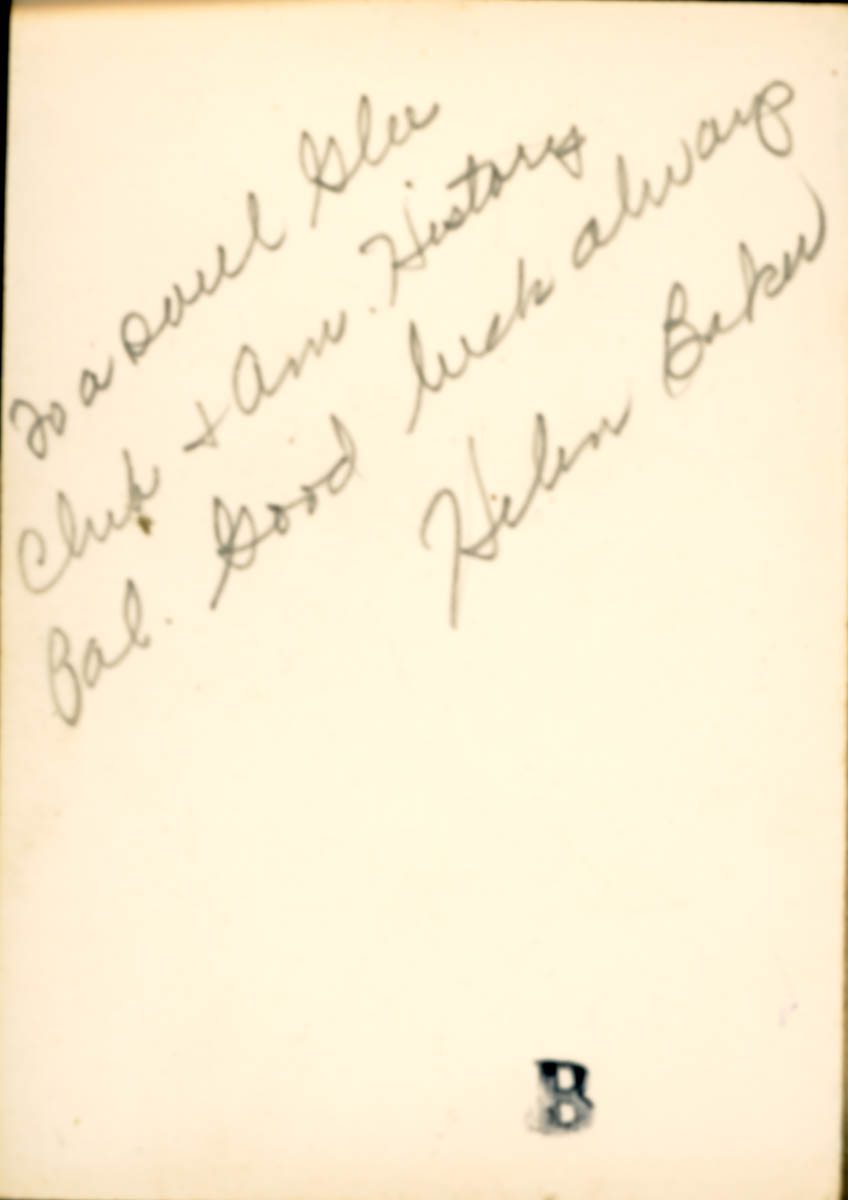 Handwritten note on back says "To a swell Glee Club & Am. History pal. Good luck always. Helen Baker" - Date